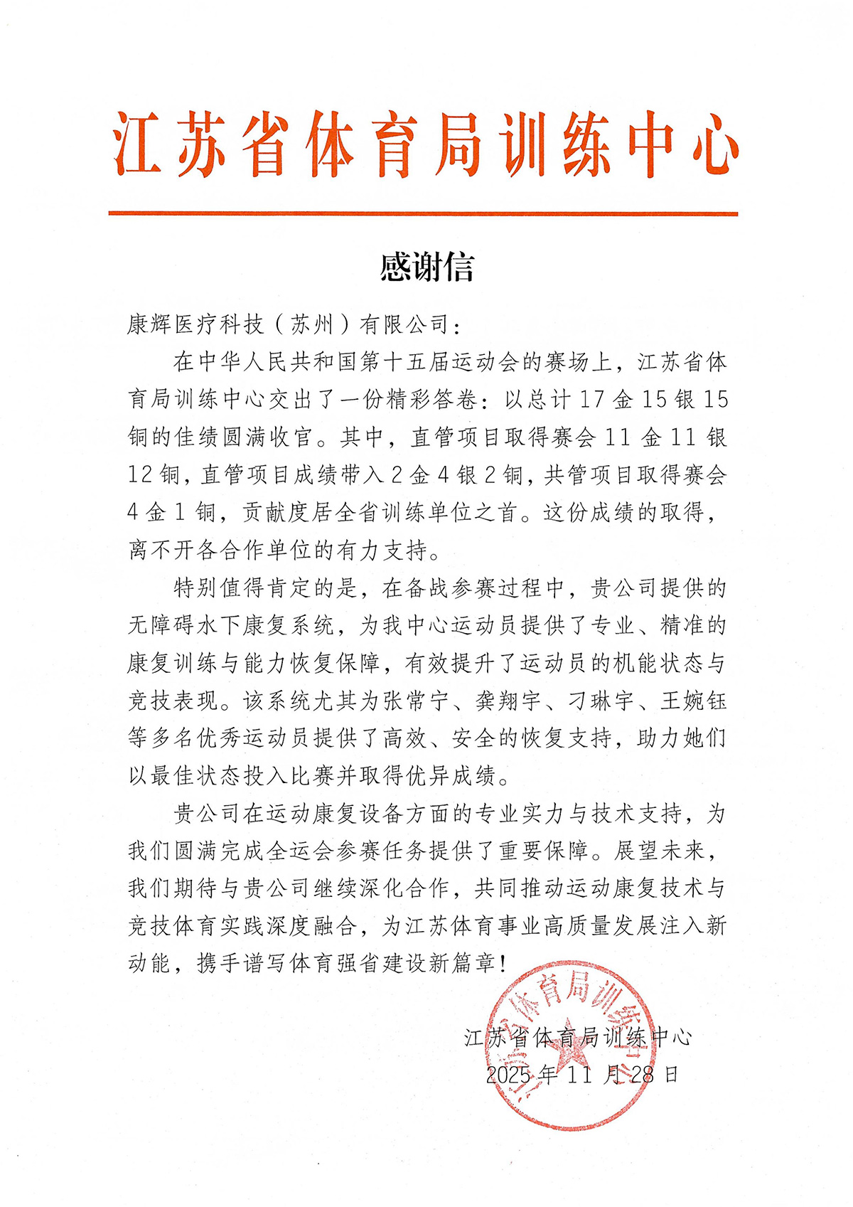 During the preparation and competition period, the barrier-free underwater rehabilitation system provided by Kanghui Medical offered athletes at the center professional, precise rehabilitation training and recovery support. This effectively enhanced the athletes' functional condition and competitive performance. The system provided efficient and safe recovery assistance to numerous elite athletes, enabling them to compete at their best and achieve outstanding results.